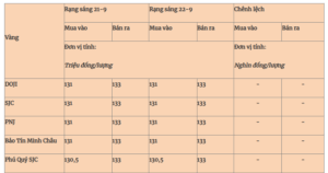 Các thương hiệu SJC, DOJI, PNJ, Bảo Tín Minh Châu đồng loạt niêm yết giá vàng miếng ở ngưỡng 131 – 133 triệu đồng/lượng (mua vào – bán ra), không thay đổi ở cả hai chiều.