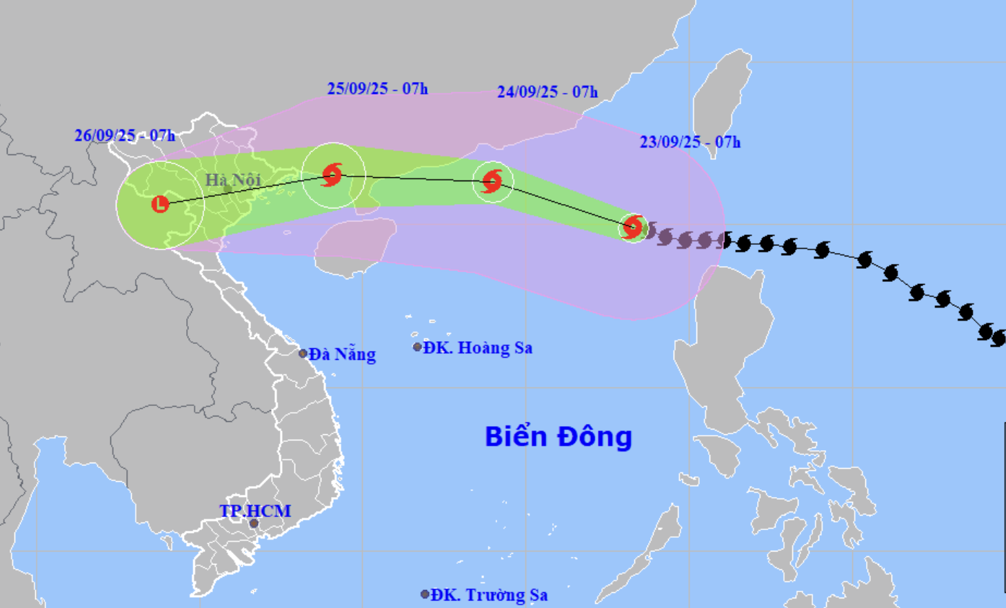 Dự báo vị trí và hướng di chuyển siêu bão Ragasa lúc 7h sáng 23-9 – Ảnh: NCHMF
