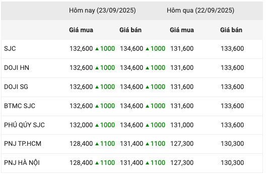 Theo khảo sát, giá vàng miếng SJC tại các doanh nghiệp lớn đồng loạt tăng từ 1 đến 1,6 triệu đồng/lượng trong phiên sáng nay. Tập đoàn DOJI niêm yết giá vàng SJC ở mức 132,6 – 134,6 triệu đồng/lượng (mua vào – bán ra), tăng 1 triệu đồng/lượng ở cả hai chiều so với cuối ngày 23/9. Chênh lệch giá mua – bán vẫn giữ ở ngưỡng 2 triệu đồng/lượng.