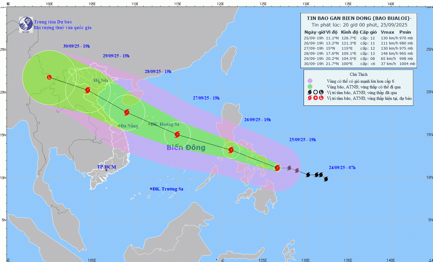 Dự báo khoảng đêm 26/9, bão Bualoi sẽ đi vào vùng biển phía Đông khu vực Giữa Biển Đông, trở thành cơn bão 10 năm 2025.