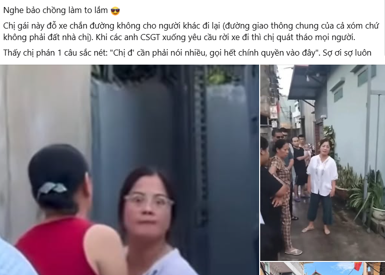 Theo clip được lan truyền, chiếc ô tô do người phụ nữ điều khiển “đỗ chắn lối đi chung” khiến người dân không di chuyển được. Khi bị nhắc nhở, thay vì hợp tác giải quyết, người phụ nữ nhiều lần lớn tiếng, thậm chí còn thách thức “gọi chính quyền vào hết đây” và tự nhận mình là “vợ cán bộ”.