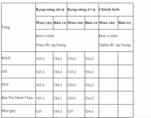Giá vàng miếng trong nước cập nhật sáng 27-9 như sau: