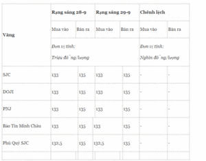 Cụ thể, các thương hiệu DOJI, SJC, PNJ, Bảo Tín Minh Châu giao dịch ở mức 133 triệu đồng/lượng mua vào và 135 triệu đồng/lượng bán ra, không thay đổi ở cả hai chiều.