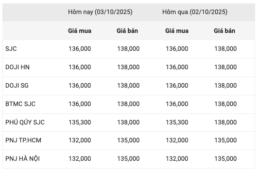 Tính đến 6h sáng nay, Tập đoàn DOJI niêm yết giá vàng miếng SJC ở mức 136 – 138 triệu đồng/lượng (mua vào – bán ra), giữ nguyên so với cuối phiên giao dịch ngày 2/10. Mức chênh lệch mua – bán duy trì ở ngưỡng 2 triệu đồng/lượng.