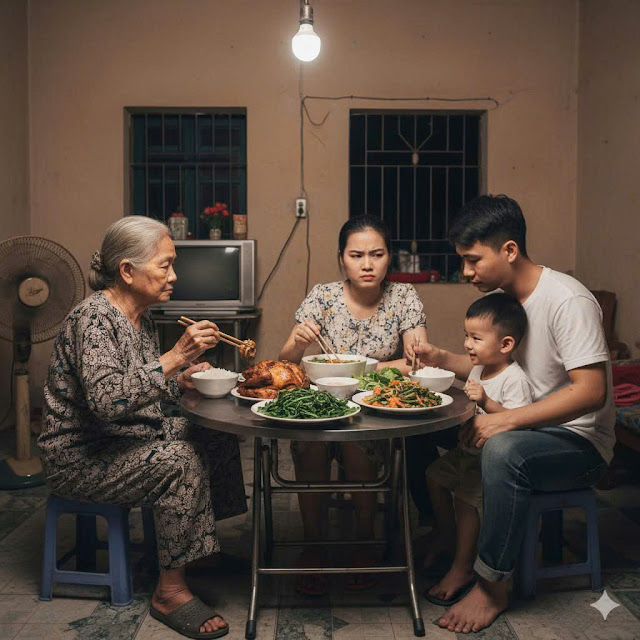 Khi bữa cơm dọn ra, cả nhà quây quần, tiếng nói cười rộn rã. Giữa chừng, thấy mâm còn thừa một chiếc cánh gà, bà Hòa khẽ gắp về phía mình. Trong khoảnh khắc ấy, một câu nói sắc lạnh vang lên: