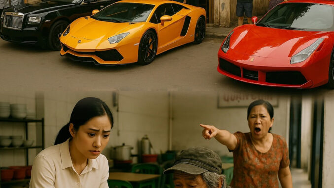 Năm chiếc xe sang — một Rolls-Royce, hai Lexus, một Mercedes, và một BMW — nối đuôi nhau đậu trước quán cơm nhỏ. Tài xế bước ra, mặc vest đen chỉnh tề. Người dân xung quanh kéo đến xem, xì xào bàn tán.
