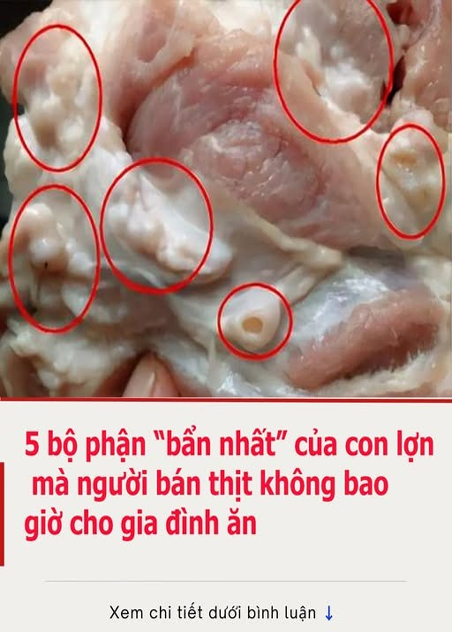 Thịt cổ số 2 Phần bẩn thứ hai của con lợn là thịt cổ. Thịt cổ huyết hay còn gọi là thịt dở. Phần thịt này có nhiều hạch. Các hạch bạch huyết là nơi lưu trữ virus bạch huyết. Ăn quá nhiều sẽ có hại cho cơ thể. Trên thịt lợn có rất nhiều nốt hạch bạch huyết, người thông minh có thể nhìn thoáng qua là biết. Phần thịt lợn này thường được bán cho các quán bún, đó là lý do tại sao nhiều quán bún có thể kiếm được rất nhiều tiền chỉ với một số tiền ít.