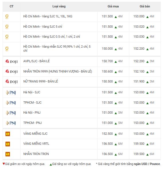 Vàng miếng SJC của các thương hiệu SJC, PNJ được niêm yết mua vào 151,5 triệu đồng/lượng, tăng 4,4 triệu đồng/lượng; bán ra 153 triệu đồng/lượng, tăng 3,9 triệu đồng/lượng so với sáng qua.