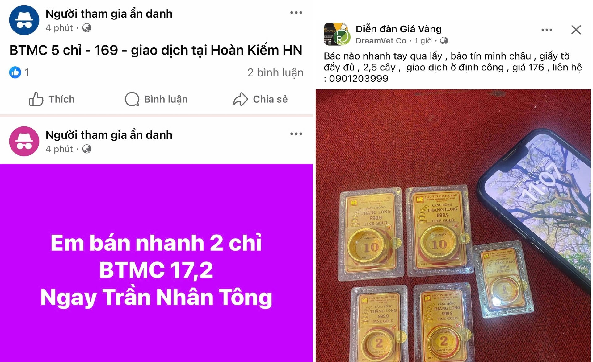 Trên các hội nhóm mạng xã hội, những bài đăng rao bán vàng SJC, vàng nhẫn Bảo Tín Minh Châu, Doji,… xuất hiện dày đặc, với hình ảnh cụ thể và lời mời gọi hấp dẫn.