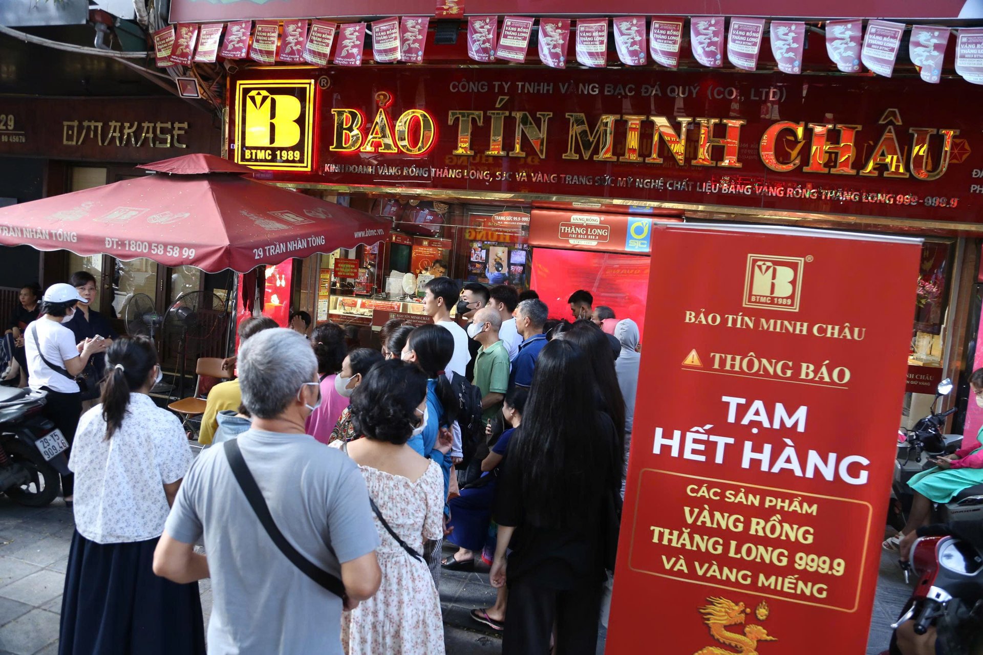 Tương tự các ngày trước đó, lượng người xếp hàng tại các thương hiệu vàng uy tín trên phố Trần Nhân Tông (Hà Nội) vẫn rất đông. Mặc dù vậy, nhiều cửa hàng tiếp tục dừng bán và chưa có thông báo bán cụ thể thời điểm bán trở lại.