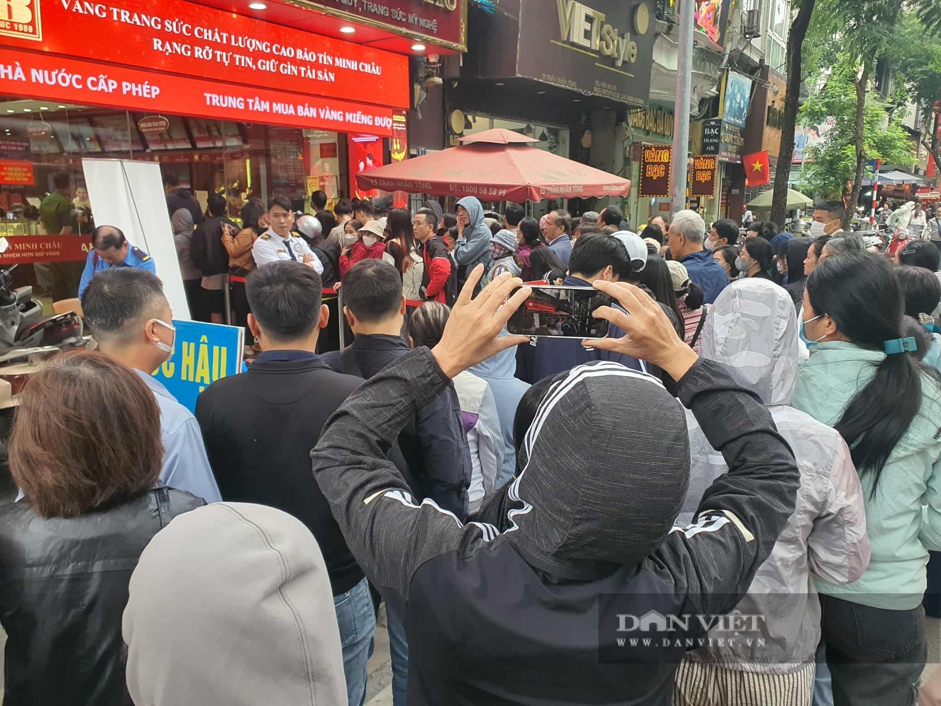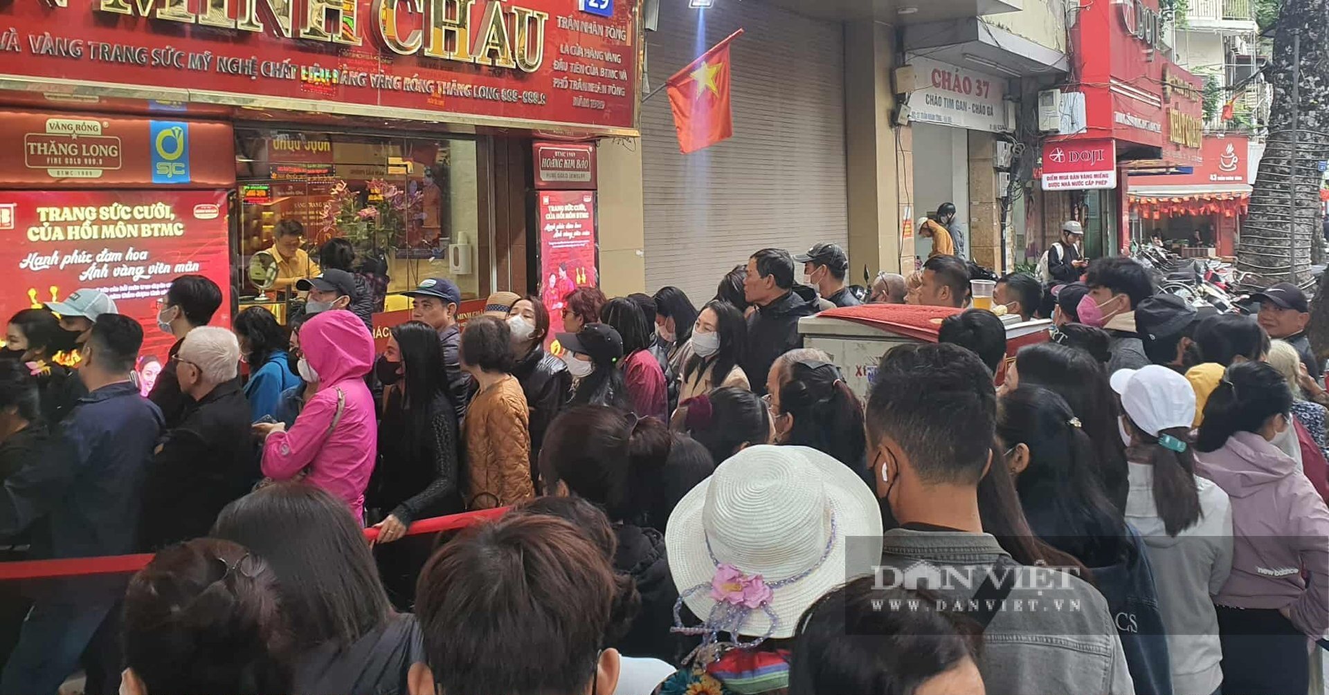 Trong sáng nay, hàng trăm người dân ùn ùn xếp hàng mua vàng tại Bảo Tín Minh Châu ở phố Trần Nhân Tông. Cửa hàng chỉ bán tối đa mỗi người 2 chỉ. Còn tại tiệm vàng Bảo Tín Mạnh Hải bán tối đa mỗi người một cây vàng.