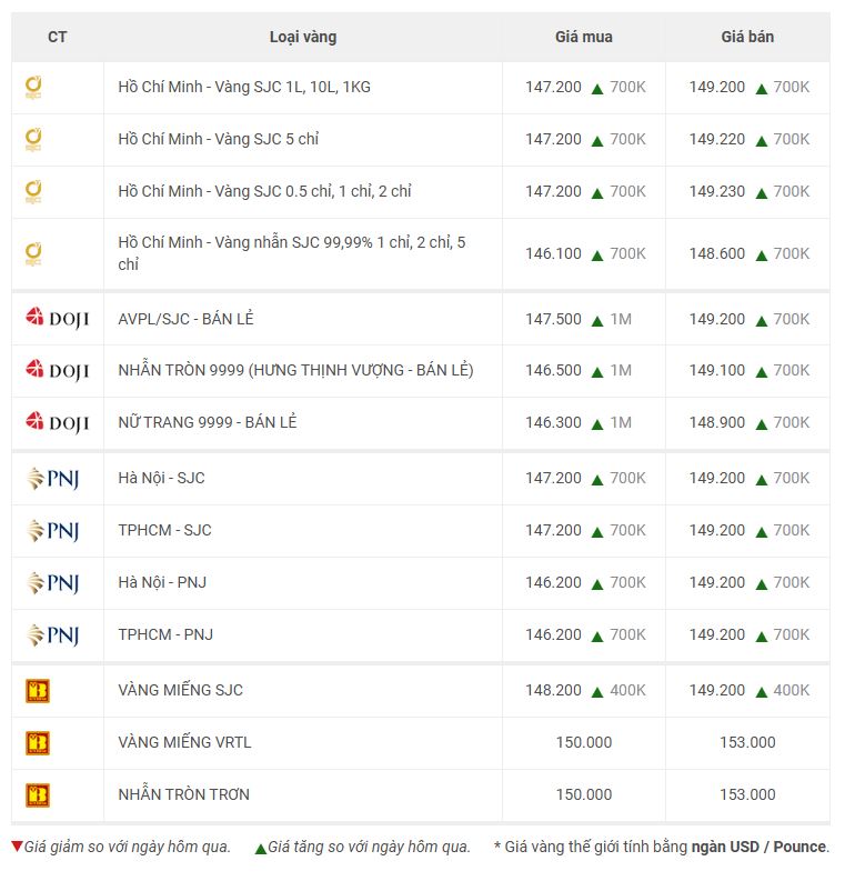 Tại PNJ, giá vàng miếng SJC ở cả Hà Nội và TP.HCM đồng loạt niêm yết 147,2 – 149,2 triệu đồng/lượng, tăng 700.000 đồng/lượng ở cả hai chiều.