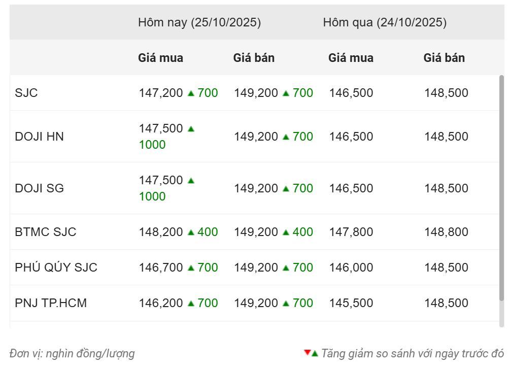 Cụ thể, theo ghi nhận vào chiều nay (25-10), Công ty vàng bạc đá quý SJC niêm yết giá vàng miếng SJC ở mức 147,2 – 149,2 triệu đồng/lượng (mua vào – bán ra), tăng 700.000 đồng/lượng ở cả hai chiều so với hôm qua.