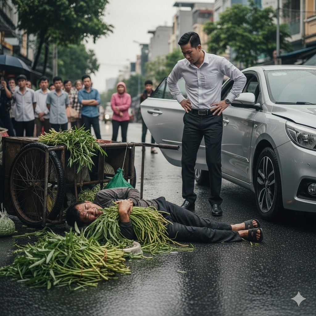 Chiếc xe rau lật nhào, rau muống tung tóe khắp đường, dập nát trong bùn đất. Chồng tôi ngã sõng soài, tay trầy xước, mặt mũi lấm lem. Anh hoảng hốt bò dậy, run rẩy nhặt từng mớ rau, vừa nhặt vừa thở dốc: