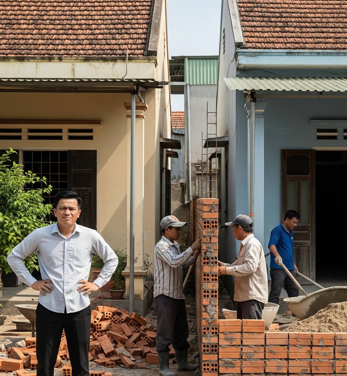 Sáng hôm sau, lúc tôi đang cắt lá chuối sau vườn thì nghe tiếng ầm ầm từ nhà bên. Tôi ló đầu ra thì thấy ông Hào đang sai thợ đập tường, xây lùi vào hẳn 50 phân.