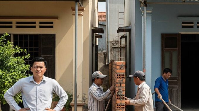 Sáng hôm sau, lúc tôi đang cắt lá chuối sau vườn thì nghe tiếng ầm ầm từ nhà bên. Tôi ló đầu ra thì thấy ông Hào đang sai thợ đập tường, xây lùi vào hẳn 50 phân.