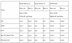 Giá vàng miếng trong nước cập nhật lúc 5 giờ sáng 16-11 như sau: