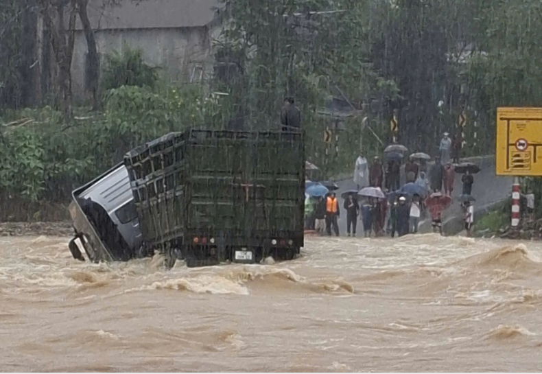 Xe đầu kéo bị nước lũ cuốn trôi khi vượt qua ngầm tràn La Lay