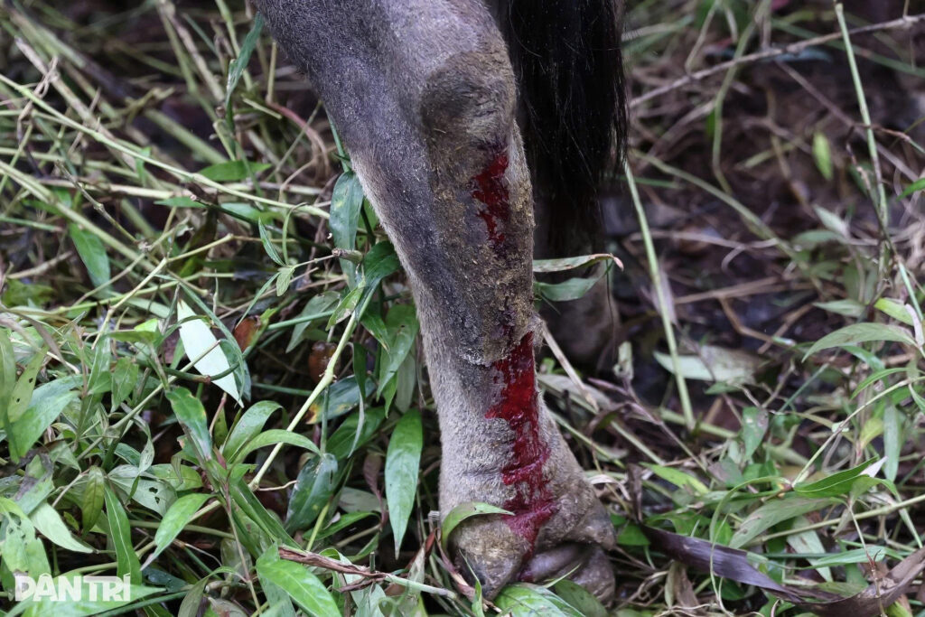 Trên chân chú trâu vẫn còn những vết thương rỉ máu, minh chứng cho cuộc chiến sinh tử trong trận lũ vừa qua.