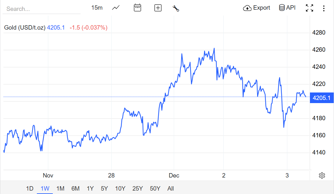 Giá vàng thế giới giao ngay trên thị trường châu Á lúc 7 giờ 45 phút sáng nay ngày 3/12 (giờ Việt Nam) giao dịch ở quanh ngưỡng 4.205 USD/ounce, giảm 20 USD/ounce so với cùng thời điểm hôm qua.