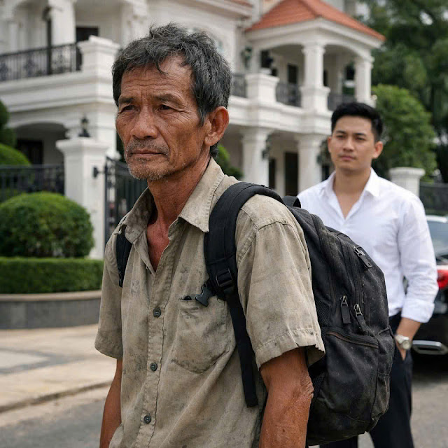 Chiếc balo sờn rách khoác sau lưng, đôi dép nhựa đã mòn gót. Cả chặng đường hơn trăm cây số từ quê lên thành phố, ông đi bằng xe đò, rồi cuốc bộ thêm gần hai cây số nữa để tìm đến căn biệt thự này.