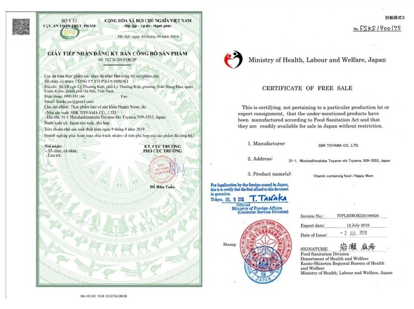 Theo đó, sản phẩm “Thực phẩm bảo vệ sức khỏe Happy Mom” đang được kinh doanh tại hệ thống là hàng hóa chính hãng, đã được Cục An toàn thực phẩm (Bộ Y tế) cấp giấy tiếp nhận công bố, đồng thời có xác nhận tiêu chuẩn chất lượng từ cơ quan y tế Nhật Bản – nơi sản phẩm được sản xuất.