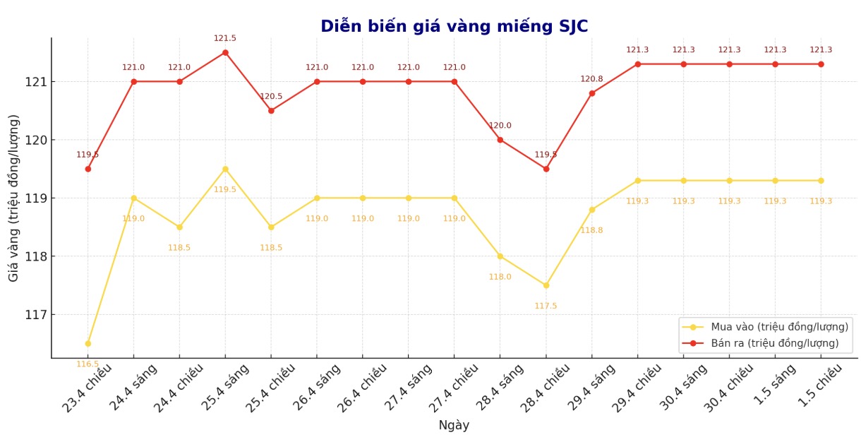 Tính đến 17h00, giá vàng miếng SJC được Công ty VBĐQ Sài Gòn SJC niêm yết ở ngưỡng 119,3-121,3 triệu đồng/lượng (mua vào – bán ra). Chênh lệch giá mua vào – bán ra ở ngưỡng 2 triệu đồng/lượng.