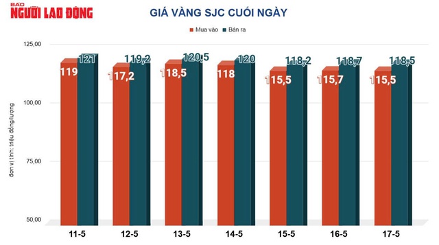 Chủ nhật, ngày 18-5, giá vàng miếng SJC được các doanh nghiệp niêm yết phổ biến quanh 115,5 triệu đồng/lượng mua vào, 118,5 triệu đồng/lượng bán ra, giảm tới 3,5 triệu đồng/lượng so với cuối tuần trước.